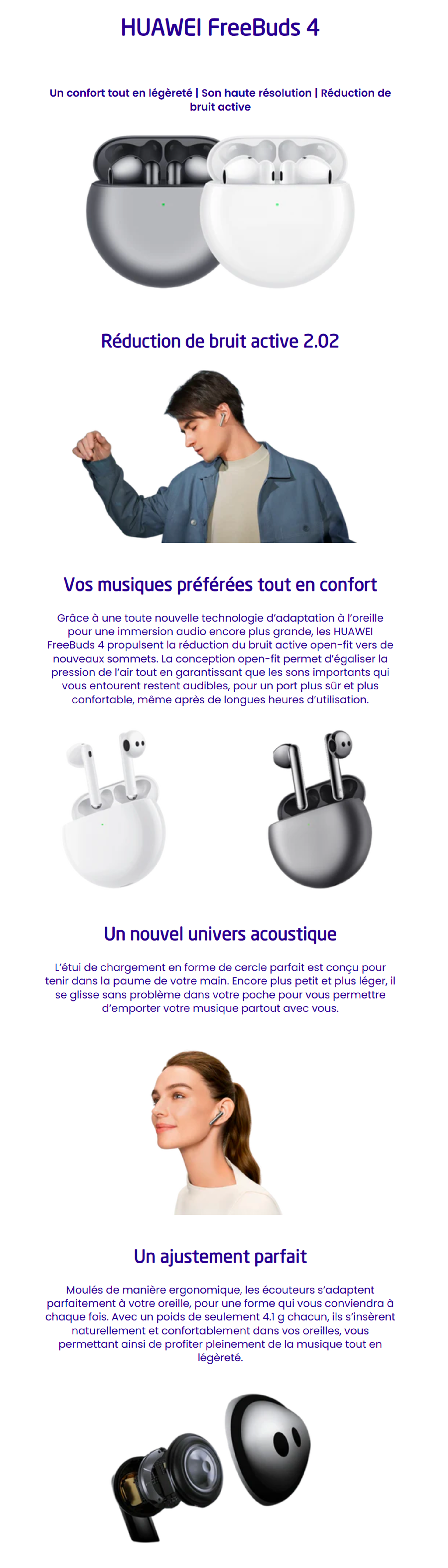 | Pièces incluses | Freebuds 4 Ceramic White et HUAWEI Adaptateur-TYPE C |